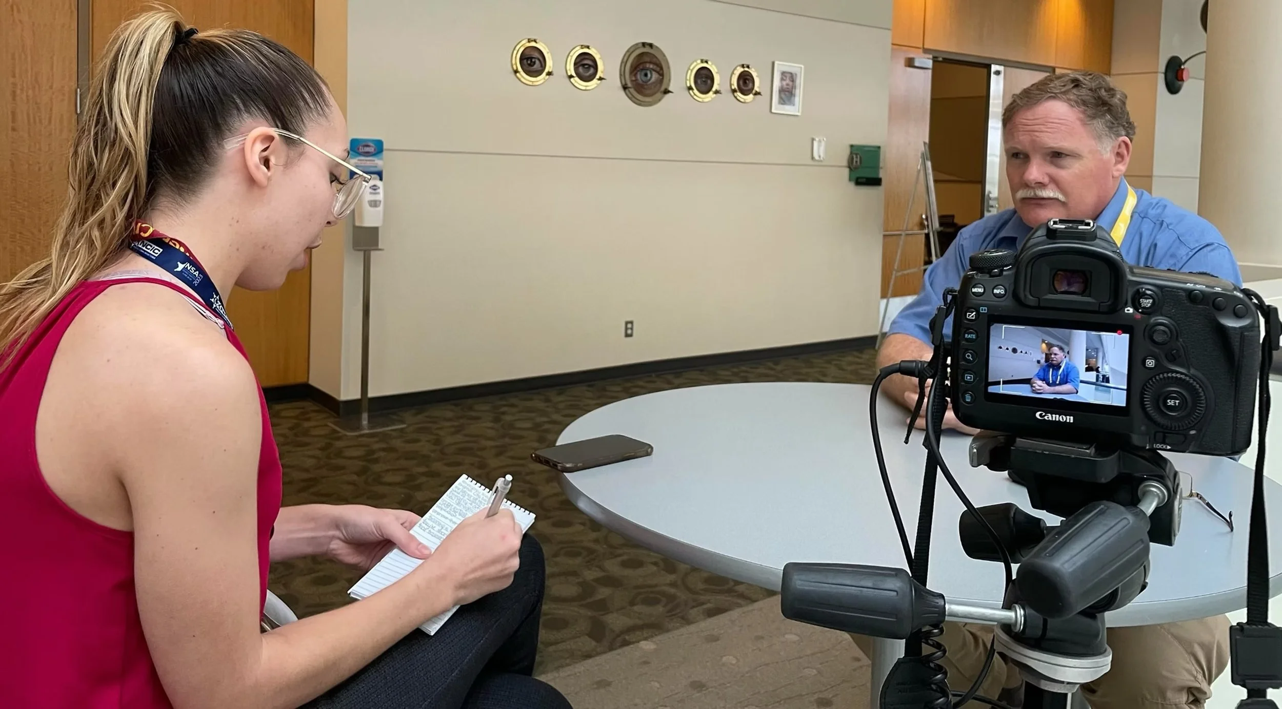 Adrienne Washington (left) interviewing Barry County Sheriff and CSPOA board member Dar Leaf at the National Sheriff's Association Conference in Grand Rapids, Michigan, for "In the Sheriff We Trust." It was a reporting priority for our team to secure an on-camera, in-person interview with a key source of our investigation, and a main priority as the lead field reporter to pursue. (Albert Serna Jr./Howard Center for Investigative Journalism)